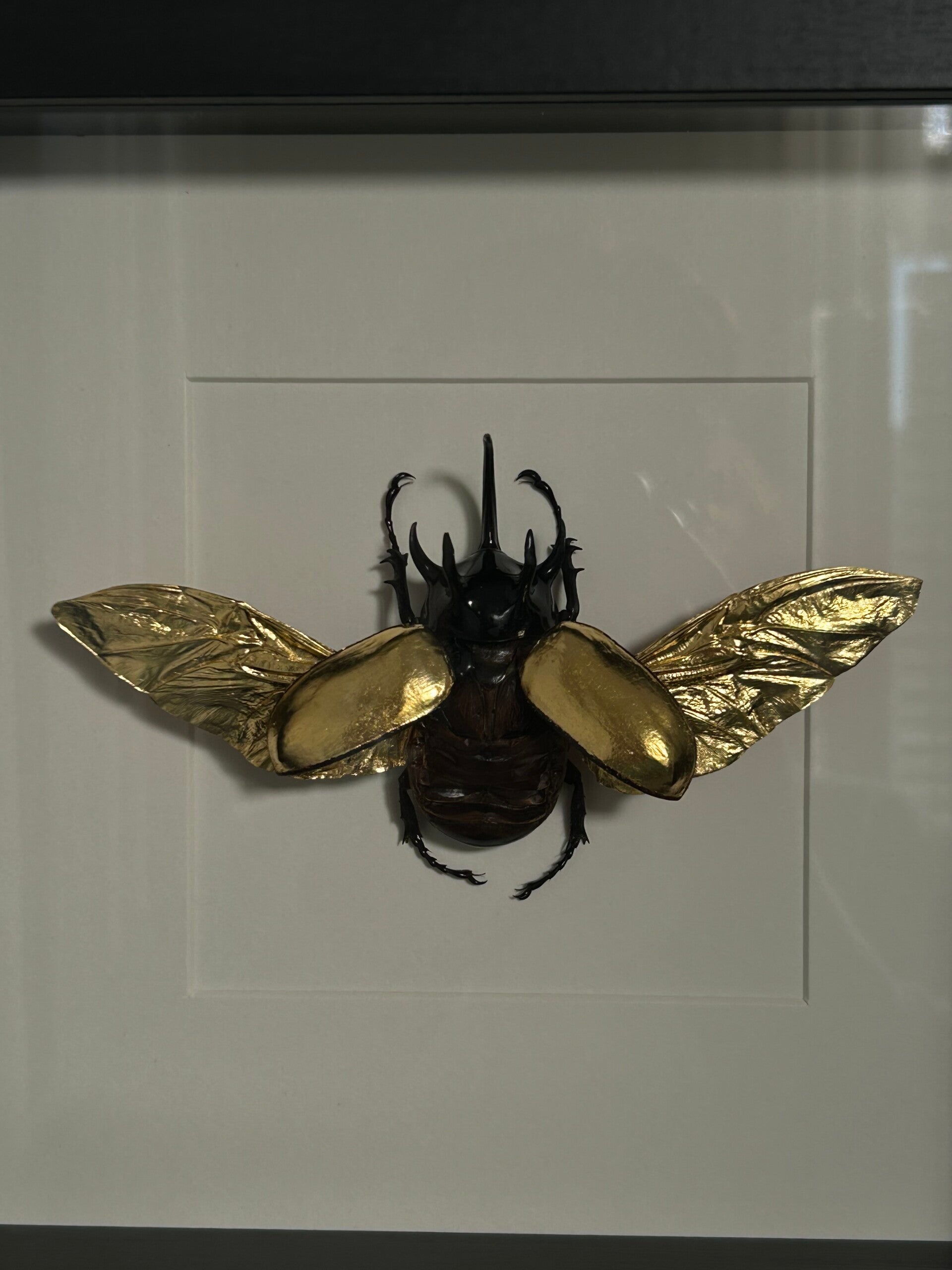 24 carat gilded Rhino beetle in frame that can be hung on the wall or stand on its own.