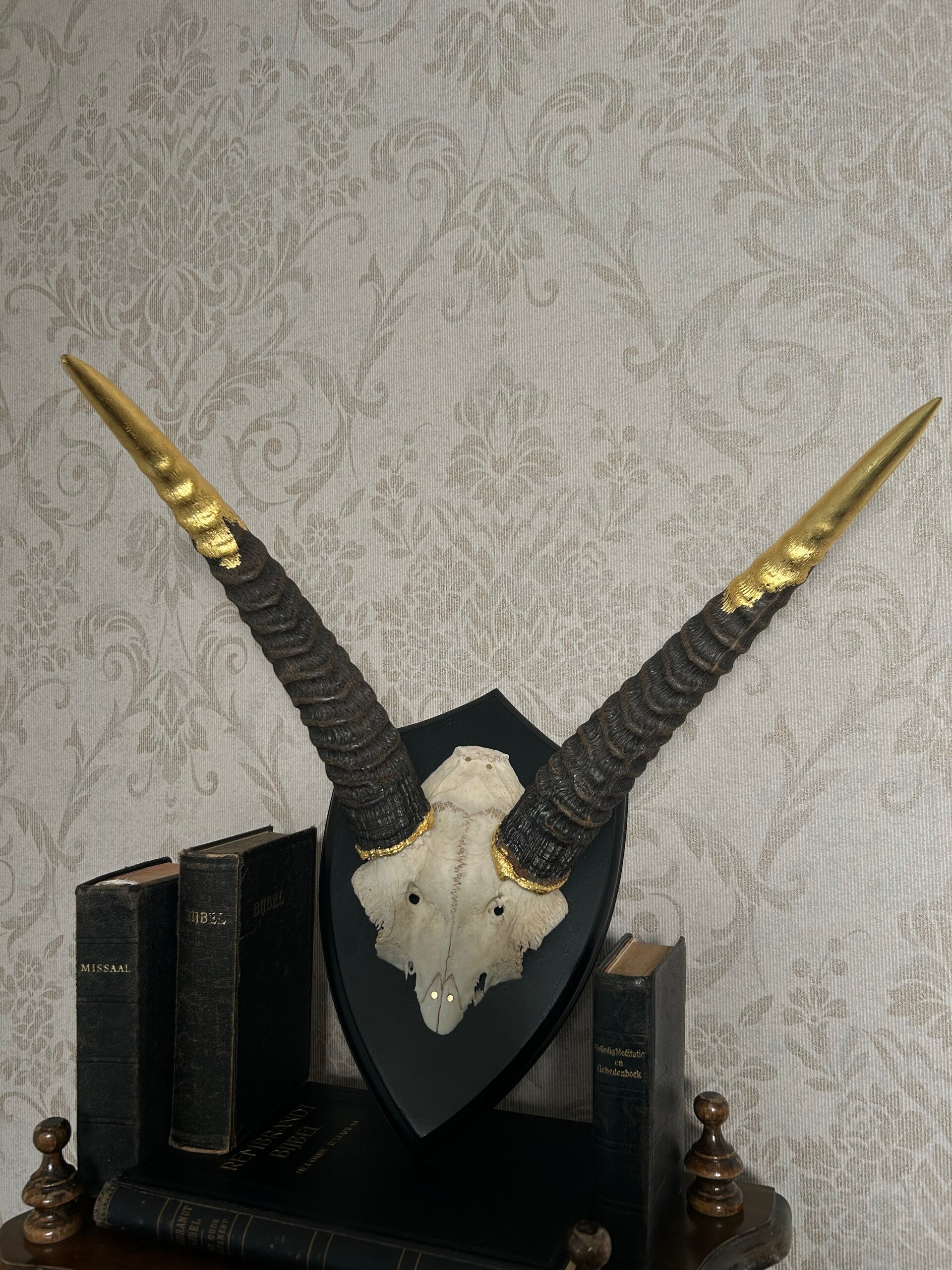 24 carat gilded antler trofee to be hung on a wall.